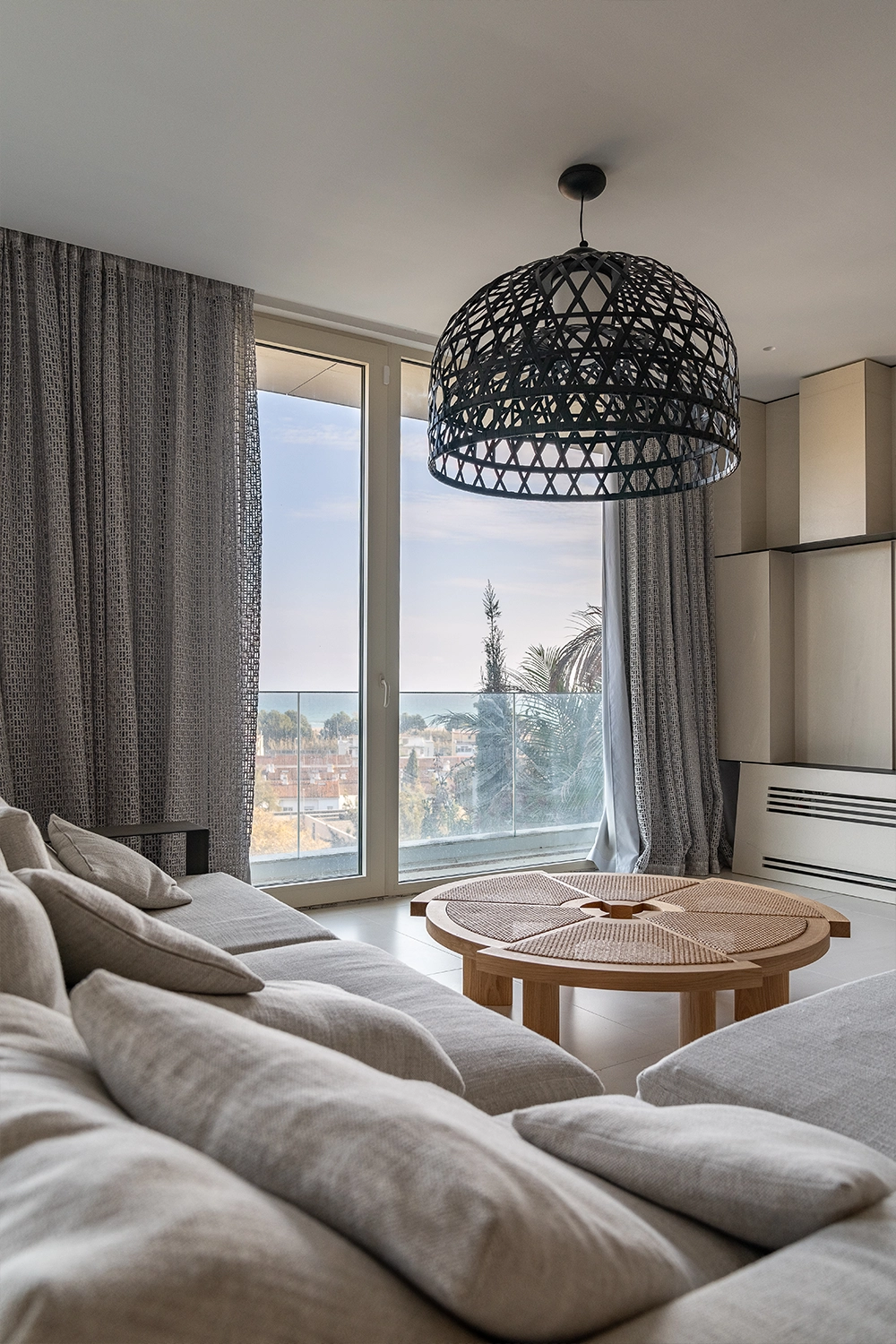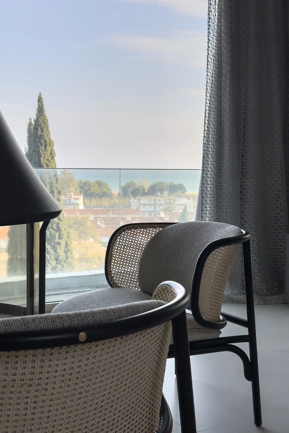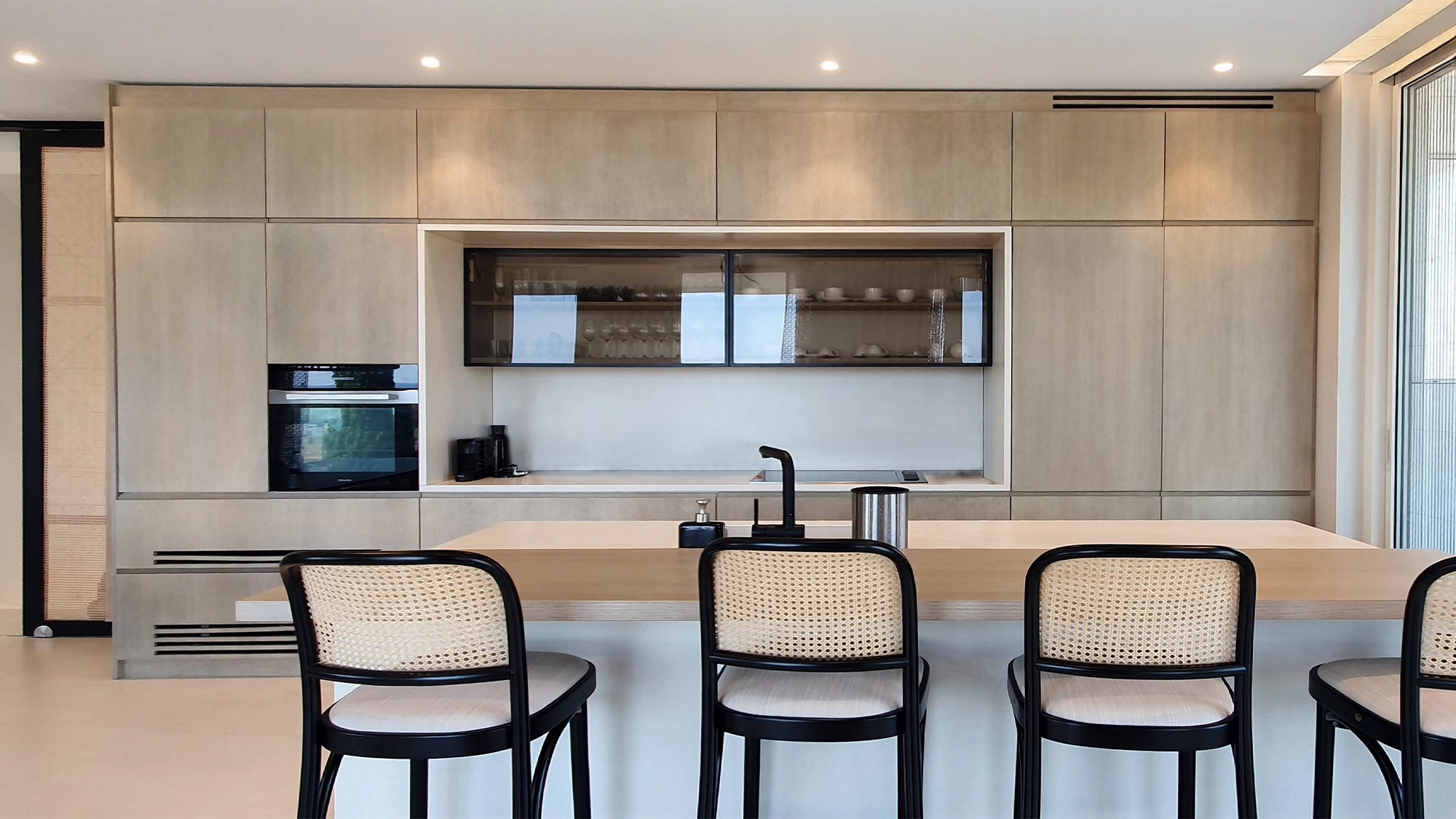 A soft palette of light beige flows through the spaces, where microcement walls and granite floors breathe both calm and coolness. Accents of rattan and black metal draw the eye, balancing serenity with strength. In the private rooms, wood veneers and blossoms infuse warmth and individuality, each space reflecting its inhabitant’s rhythm.