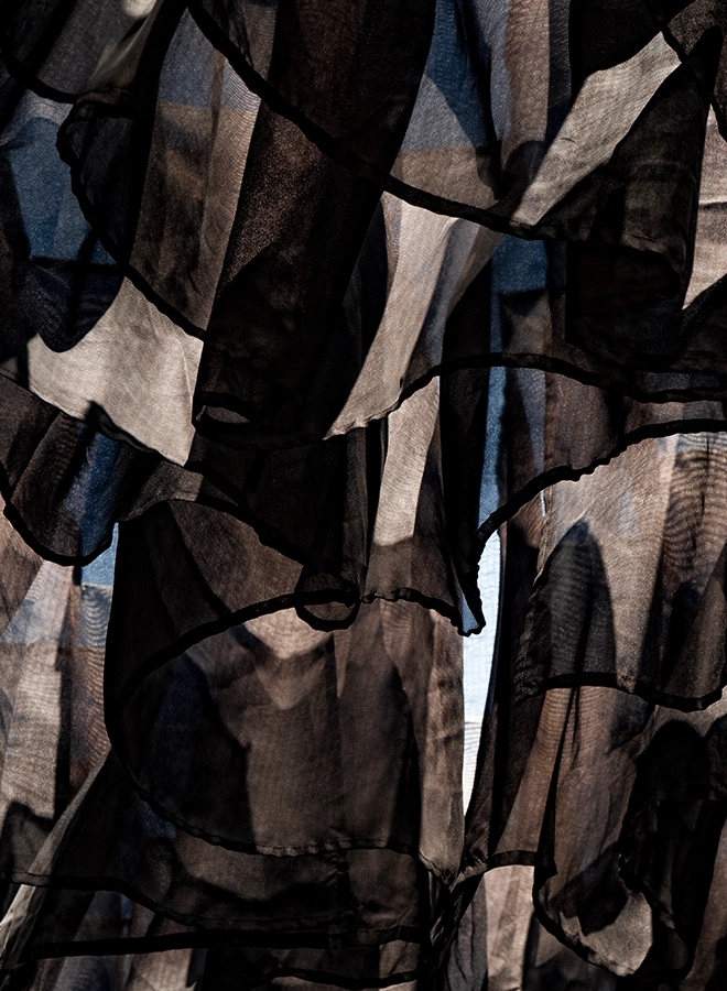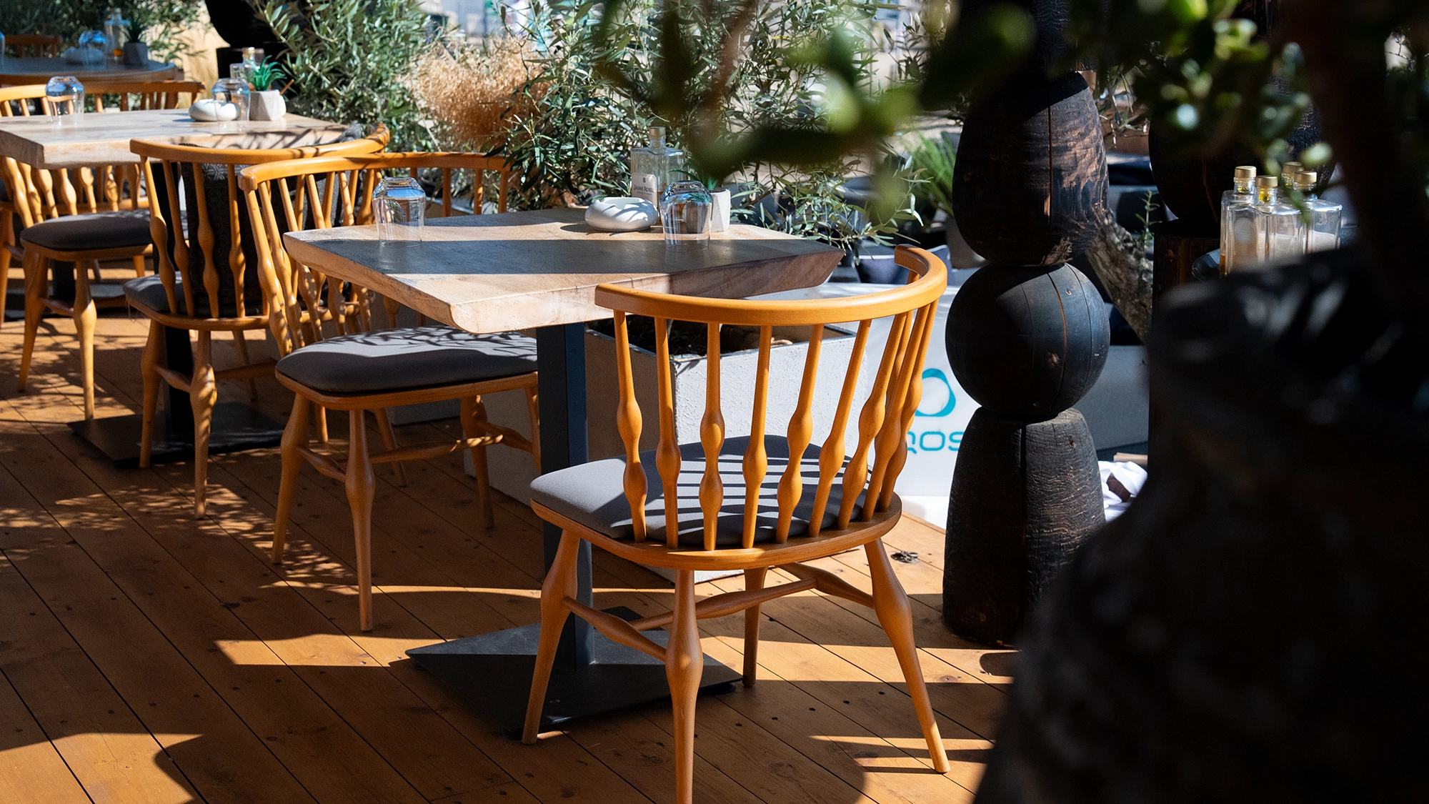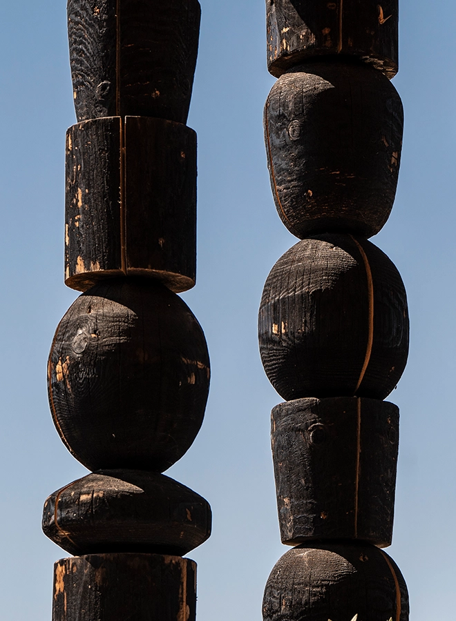Its identity lies in black: burnt timber defines the structures and sculptural columns, strung like necklaces of beads, the crown jewel of the site.